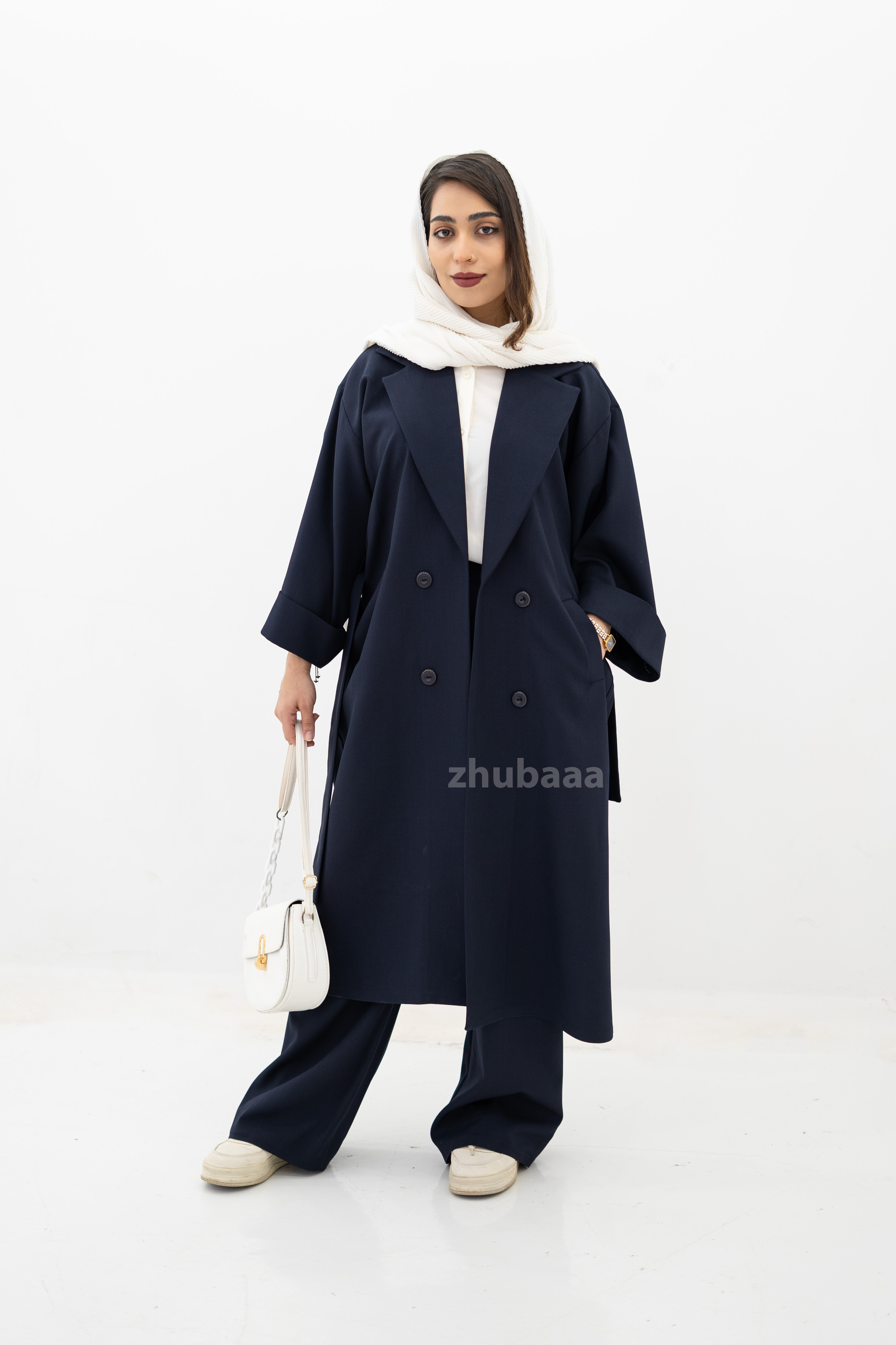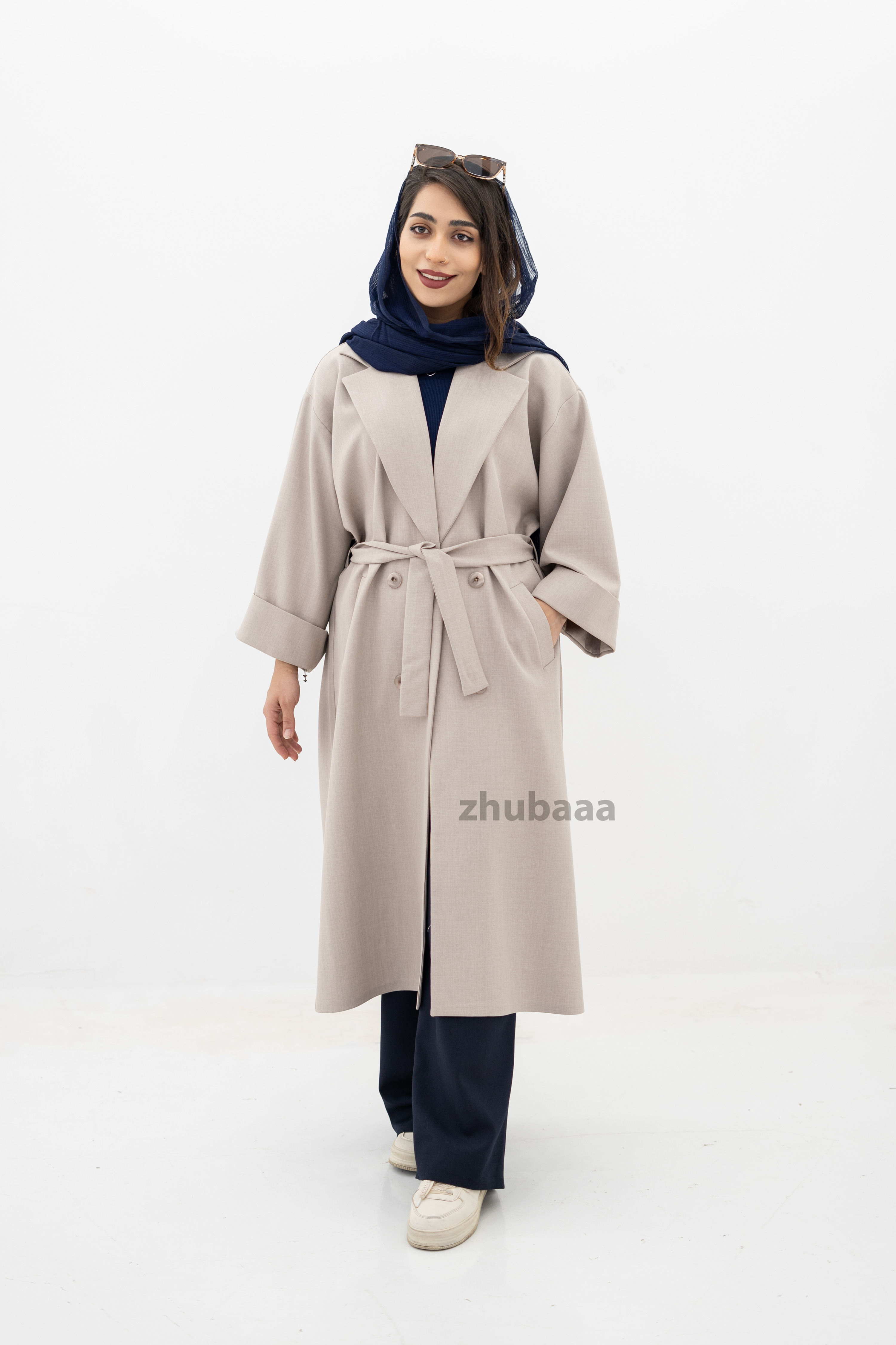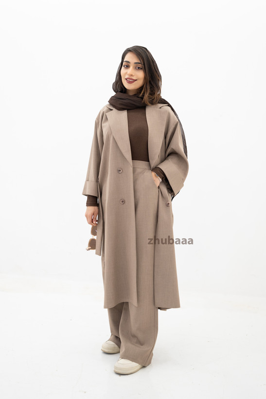 این محصول یک کت بلند زنانه با برش انگلیسی (مدل مانتو کتی) است که به نام "آنجل" (کد ۳۰۳) شناخته میشود. طراحی آن اورسایز و شیک بوده و برای استایلهای رسمی یا کژوال مناسب است. کت در عکس به رنگ کرم موکا یا بژ خنثی نمایش داده شده و با یک ست بافت زیرین و شلوار گشاد همرنگ، و همچنین یک روسری مشکی یا قهوهای تیره استایل شده است.